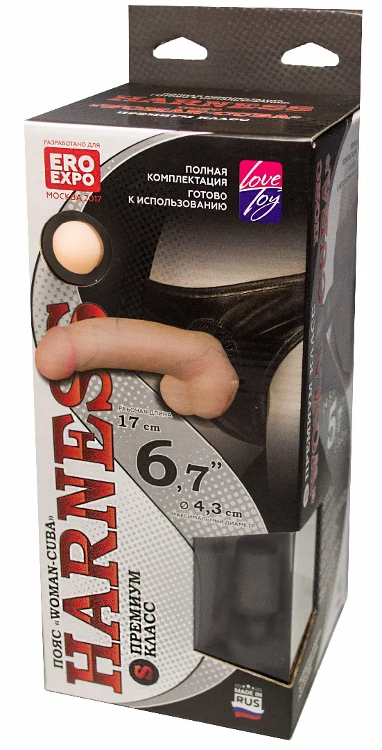 Трусики из эластичной кожи с резиновым кольцом для насадок. Дополнен пряжками для регулировки размера и двумя насадками. Одна насадка из материала Неоскин- имеет мощную присоску. Вторая насадка из полужесткого материала (подходит для анального проникновения). Характеристика: длина насадок- 14,5 и 17 см, диаметр насадок- 3,2 и 4,3 см. Упаковка: картонная коробка с принтом.