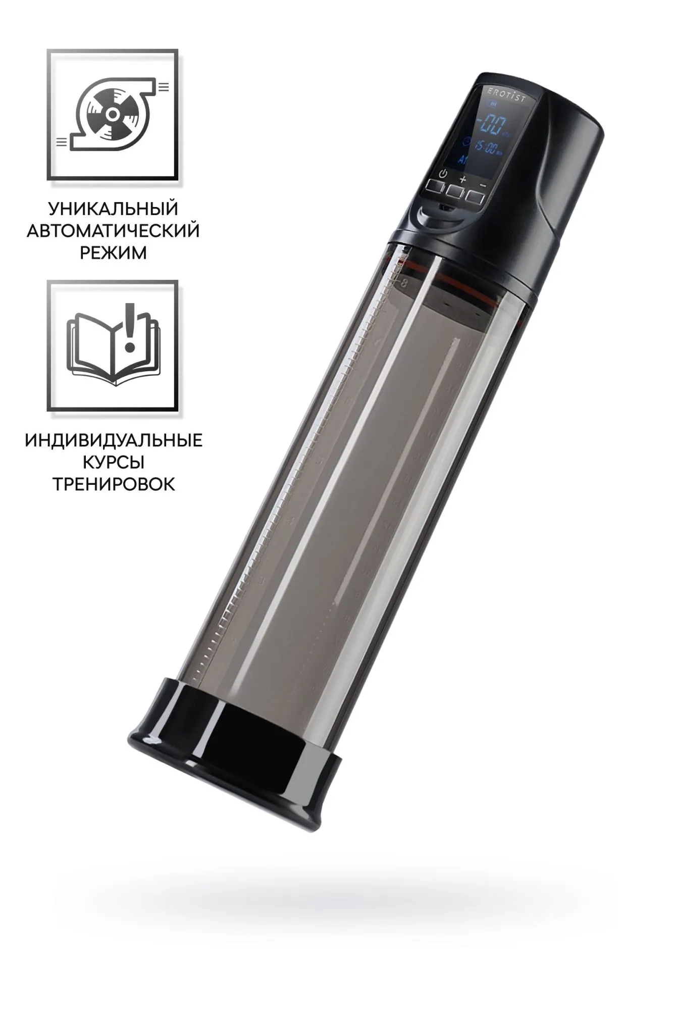 Первый полностью автоматический вакуумный тренажер для мужчин Erotist ToZoom — эффективное устройство для увеличения полового члена, поддержания мужского здоровья и улучшения качества эрекции. Работа на основе вакуумных технологий. Erotist ToZoom представляет собой прозрачную колбу, в которой с помощью вакуума создается разрежение воздуха. Для корректной работы устройства необходимо плотно прижать помпу к телу для создания полного вакуума. В случае попадания воздуха в колбу в процессе работы сработает предохранитель и произойдет выключение устройства. Уникальный автоматический режим с 4 программами. Значительно упрощает процесс тренировок. Вы лишь выбираете комфортную программу и нажимаете кнопку, дальше тренажер все делает за вас. Дополнительный ручной режим. Помогает настроить тренажер под индивидуальные особенности. Вы сами контролируете свои занятия и устанавливаете подходящие значения. Индивидуальные курсы тренировок. Для вашего удобства разработаны три курса тренировок: Fast Power для мощного кратковременного увеличения члена, Men's Health для профилактики здоровья и Max Size для долговременного увеличения члена. Видимый результат. Уже после 15 минут применения ваш член увеличится в размере. Этот эффект будет держаться в течение 1-2 часов. Постоянный результат достигается за счет регулярных упражнений. Гарантия 1 год. Стань мощнее с Erotist ToZoom!