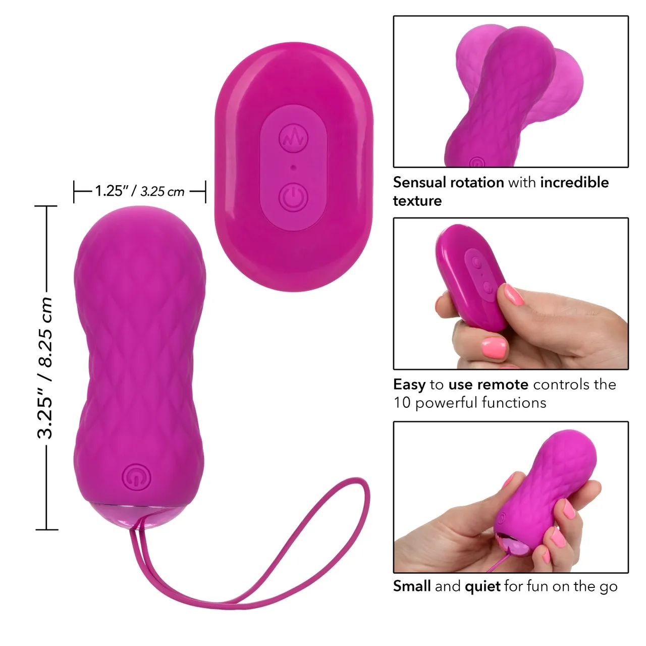 Поистине уникальный дизайн позволяет совершать вращательные движения. Этой игрушкой для взрослых с невероятной текстурой можно управлять с помощью пульта дистанционного управления или без него, поэтому данный девайс подходит для сольных игр и игр в паре, где можно дать своему партнеру возможность контролировать удовольствие на расстоянии до 10 метров.