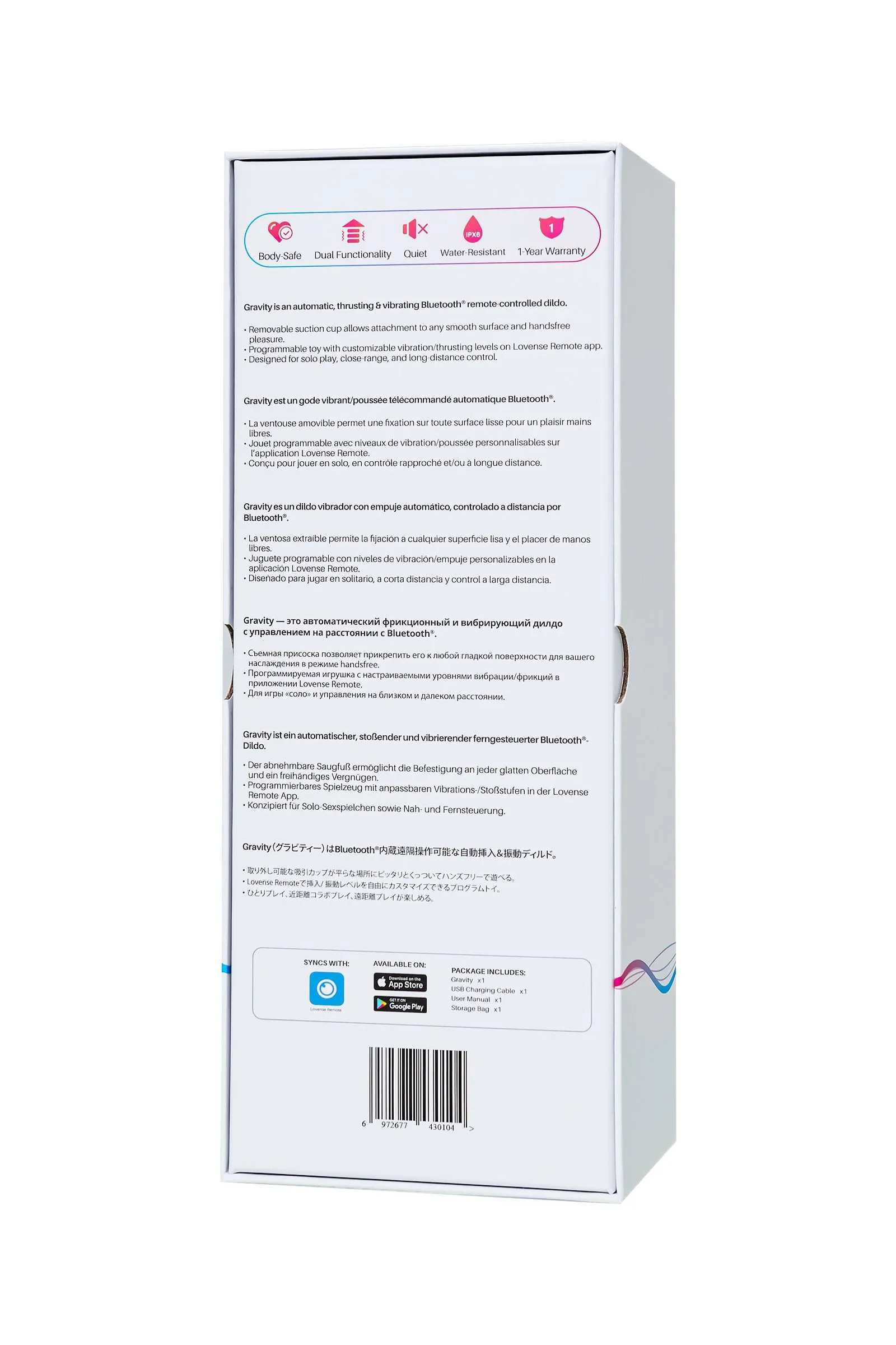 Быстрый, интенсивный и долгоиграющий фрикционный фаллоимитатор Gravity от Lovense предлагает бесконечное число стилей игры. Полностью автоматический вибратор-пульсатор способен за секунды превратить любую гладкую поверхность в идеального партнера для секса. А это означает, что сверхмощные интенсивные оргазмы набирают обороты. Gravity превратит вашу игру в мини-формат секс-машины и подтолкнет к невероятному наслаждению. Двойные ощущения Вибрации и фрикции управляются независимо друг от друга. Бесчисленное сочетаний вариаций для ультрасовременных ощущений и оргазмов. Узнайте на что способно ваше тело с Gravity. Скорость фрикций – до 140 ударов в минуту, длина хода – 3 см. Режим "Handfree" Сверхмощная присоска позволяет использовать игрушку в режиме "Handsfree". Gravity крепится к любой гладкой поверхности и под любым углом – для удобного использования без помощи рук. Дарите ласки и прикосновения себе или партнеру. Супер мощный и долгоиграющий Два мотора обеспечивают интенсивные ощущения, которые подарят множественные оргазмы. Время использования до 240 минут. Режим ожидания до 120 часов. Предустановленная программа: 3 уровня мощности До 10 паттернов вибрации Ультрасовременный дизайн Уникальный сочный ягодный цвет и гладкий как шелк силикон в сочетании с нейтральным внешним видом гарантируют полет фантазии и удовольствие от каждого прикосновения. Рабочая длина 13 см, диаметр – 3,7 см. Водонепроницаемость IPX6 Gravity не боится брызг, его легко и быстро мыть. Неограниченные возможности с приложением Lovense Remote Gravity — это полностью программируемый фрикционный и вибрирующий фаллоимитатор с управлением на расстоянии, который можно настроить на широкий диапазон уровней вибрации. Приложение Lovense Remote позволяет выбрать уровень мощности, соответствующий вашим индивидуальным потребностям. Передайте контроль своему партнеру на расстоянии и почувствуйте наслаждение от мощного проникновения. Вы забудете, что ваш партнер не рядом с вами. Соло-игра или секс втроем Найдите любую гладкую поверхность и наслаждайтесь проникающими движениями Gravity внутрь и наружу, регулируйте скорость и интенсивность по своему вкусу. Используйте Gravity без присоски в постели для проникновения и стимуляции зоны G как вам нравится. Кроме того, тайные фантазии о сексе втроем могут осуществиться. Установите Gravity на любой гладкой поверхности и наслаждайтесь своим партнером в полной мере. Что в комплекте: Gravity Автоматический фрикционный и вибрирующий фаллоимитатор с Bluetooth USB Кабель для Подзарядки Руководство пользователя Сумка для Хранения
