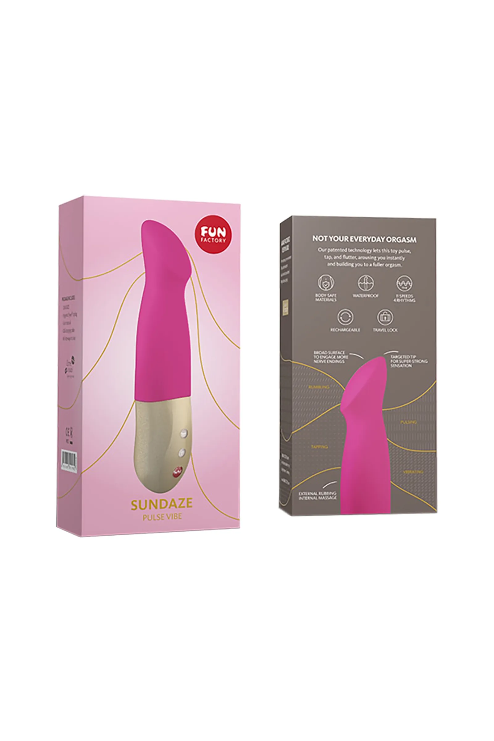 СУПЕР-НОВИНКА! Универсальная модель пульсатор и вибратор в одном корпусе. Вибратор - пульсатор SUNDAZE. Классный, необычный, суперский, и это не все восторженные отзывы, которые вы услышите. Это самый тихий вибратор-пульсатор из нашей линейки. Точечное попадание на точку G. Мягкая бархатистая поверхность! Нажми кнопку и посмотри, как вибрация передаётся на головку вибратора. Он найдет каждую эрогенную зону и заставит тебя расслабиться. Этот продукт создан для длительных, интенсивных и совершенно невероятных оргазмов! Мы не говорим о каком-то быстром и поверхностном клиторальном оргазме, а о новой инновационной технологии, которая обеспечивает глубокие и полноценные оргазмы, которые действительно удовлетворяют. Запоминание любимого режима. Просто подержи 5 сек. кнопку FUN и в следующий раз, при первом включении ты сразу почувствуешь любимый режим; 3 уровня вибрации и 8 режимов пульсации, 3 динамических режима, благодаря раздельному управлению; стильная рукоятка SUNDAZE не только красива, но и очень практична, даже если ты любишь использовать много смазки; SUNDAZE полностью водонепроницаемый. Он прекрасно подойдет тем, кто любит игры в душе или ванной;