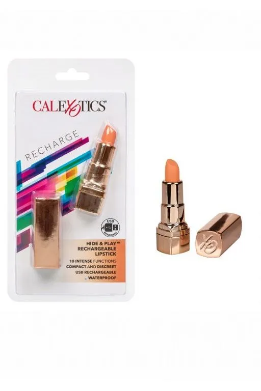 Hide & Play Rechargeable Lipstick – перезаряжаемый мульти скоростной миниатюрный вибромассажер, выполненный в виде помады. Корпус изготовлен из гладкого, не содержащего фталатов АБС-пластика, покрытого золотым полеуретановым покрытием, а головка выполнена из мягкого ультра-плюшевого силикона. Бесшумный двигатель вибратора обеспечивает 10 различных функций вибрации, пульсации и эскалации.