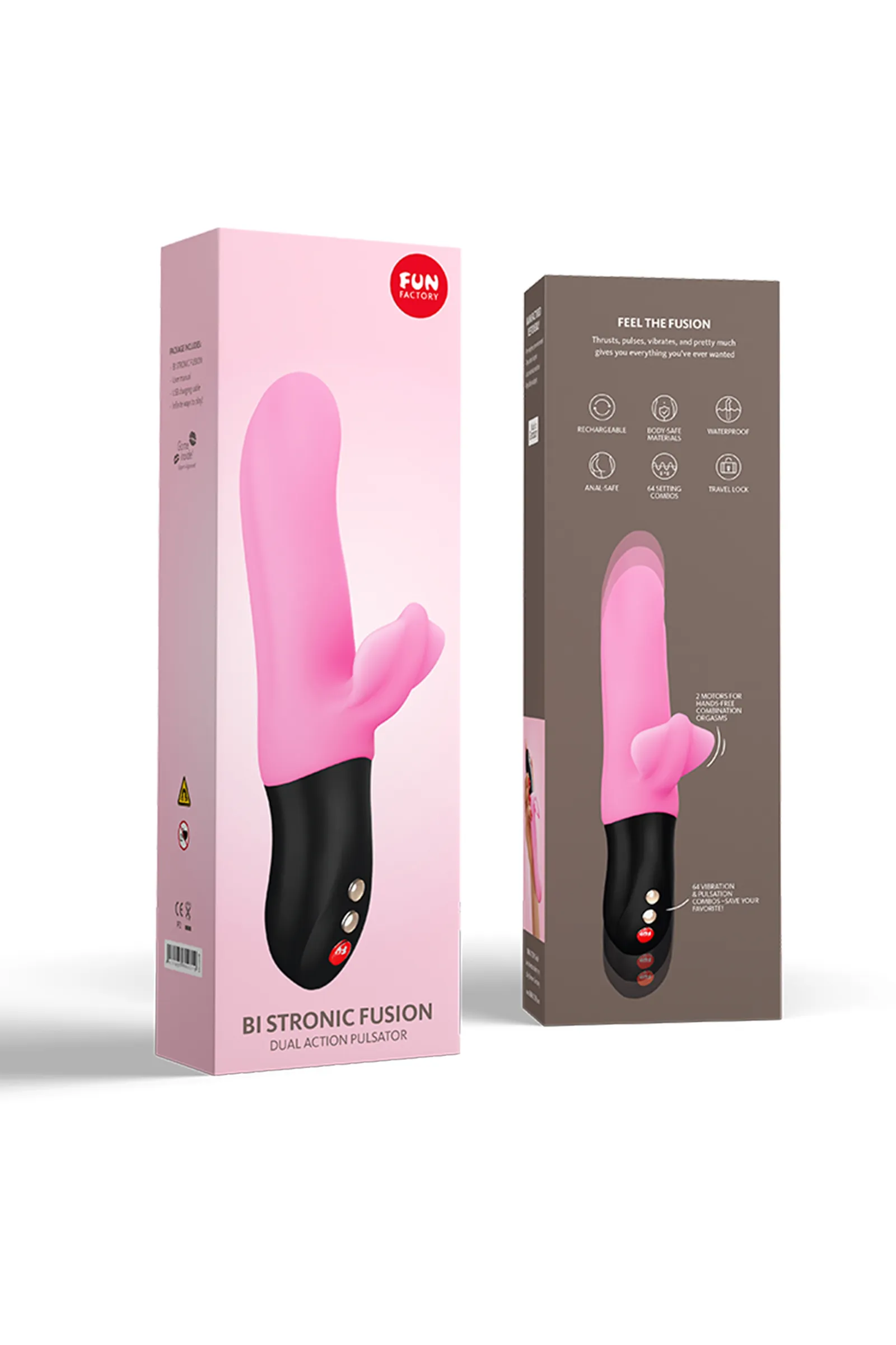 Пульсатор Fun Factory Bi Stronic Fusion — идеальный любовник: • Его многофункциональность поражает: пульсатор совмещает в себе мощный клиторальный вибратор, массажёр точки G или простаты, а также стимулятор влагалища, половых губ или ануса. • Его инновационный принцип работы позволяет насладиться и вибрацией, и пульсацией, которые могут работать вместе или независимо друг от друга. • Его интуитивно понятная панель управления молниеносно отзывается на любое желание, в том числе на мгновенную остановку. • Его расширенный функционал — светящийся индикатор заряда аккумулятора и блокировка замка — помогает держать удовольствие под контролем. • Его водонепроницаемая поверхность никогда не откажет в совместном принятии расслабляющей ванны. • Его зарядка от USB-провода быстро возвращает разрядившуюся игрушку в строй. С пульсатором Fun Factory Bi Stronic Fusion жаркие оргазмы станут постоянными спутниками интимных сессий!