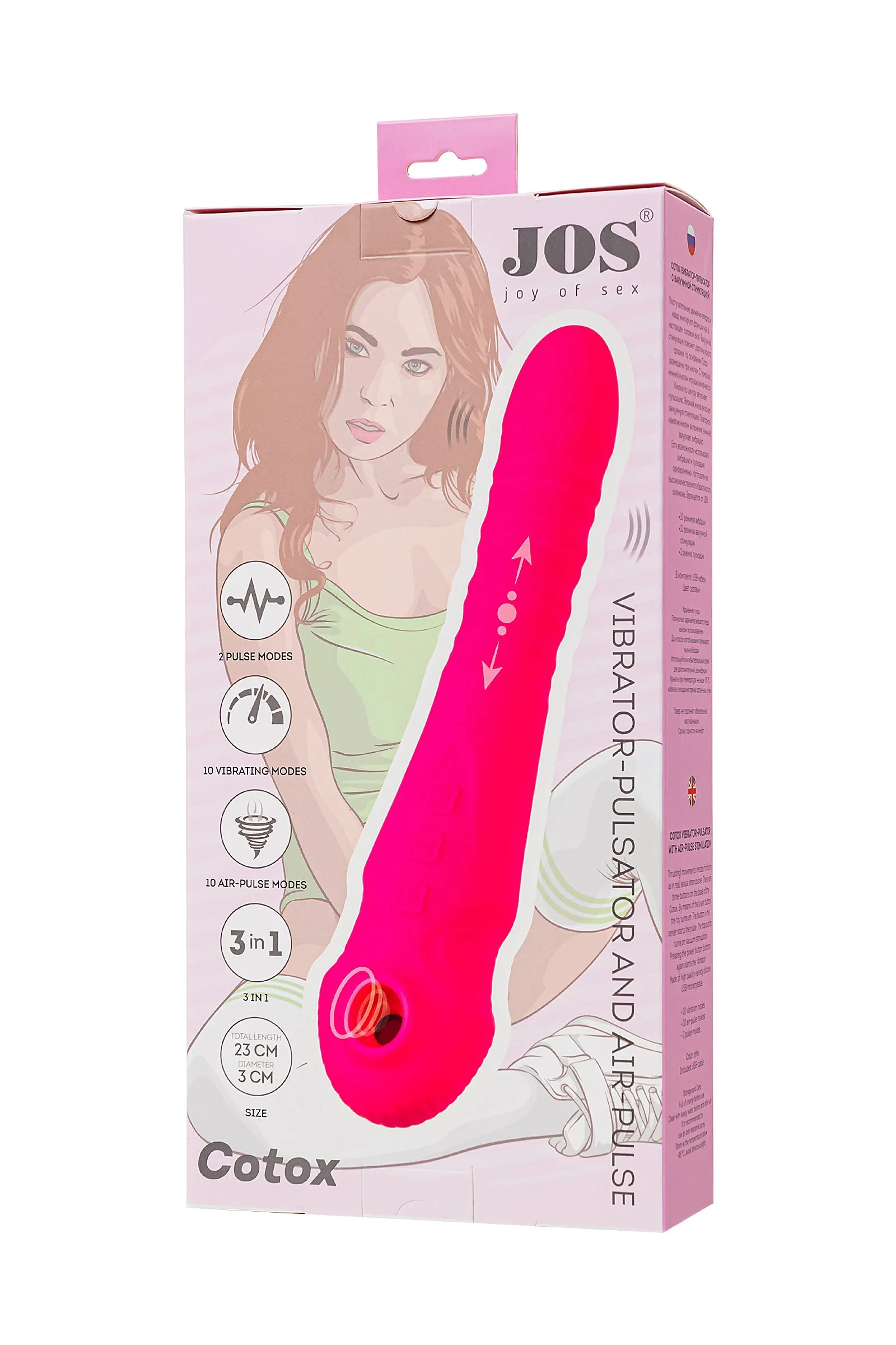 Встречайте COTOX – вибратор-пульсатор с вакуумной стимуляцией от самого необыкновенного бренда JOS! Cotox – это не просто игрушка, это источник новых, невероятно реалистичных ощущений. Разделенная на внешнюю и погружную части, она предлагает две удивительные функции в одной игрушке. Погружная часть оснащена механизмом, который создает пульсирующие фрикции, словно настоящий интимный контакт. Поступательные движения вперед и назад имитируют фрикции, даря вам максимальное удовлетворение. Вакуумная стимуляция второй части помогает достичь оргазма нового уровня яркости. Но это еще не все! Обе части могут работать независимо друг от друга. Управление интуитивно понятно: нижняя кнопка - включение, центральная - пульсация, верхняя - вакуумная стимуляция. Разнообразьте свой опыт, используя вибрацию и пульсацию одновременно. Cotox изготовлен из высококачественного бархатистого силикона, обеспечивая максимальный комфорт. Заряжается от USB, что делает его современным и удобным для использования. Не забывайте о правильном хранении и уходе за Cotox, чтобы он всегда оставался вашим верным спутником. Используйте лубриканты только на водной основе. Перед первым использованием полностью зарядите вибростимулятор. После использования промойте его мыльной водой и дезинфицируйте антибактериальным спреем, чтобы сохранить его гигиеничность и долговечность. Технические характеристики: 10 режимов вибрации 10 режимов вакуумной стимуляции 2 режима пульсации 2 мотора Общая длина 23 см Рабочая длина 13 см Диаметр 3 см *Цена на данную новинку может изменяться в соответствии с курсом валют.