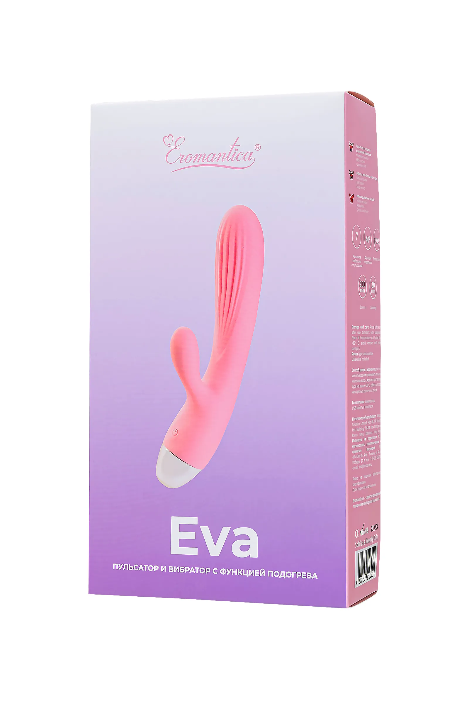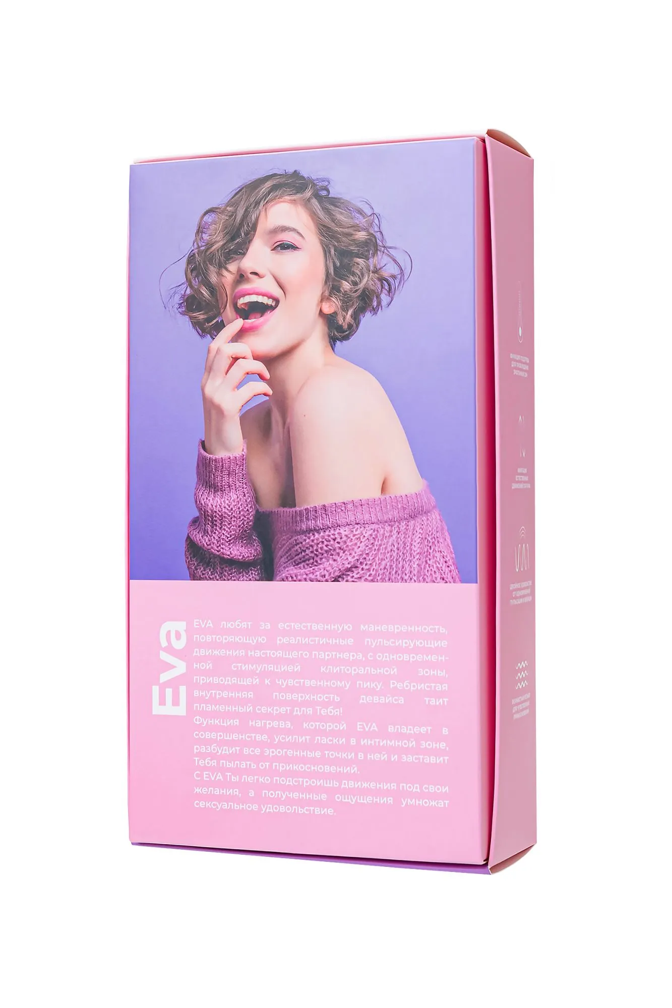 EVA симпатизируют за естественную маневренность, повторяющую реалистичные пульсирующие движения настоящего партнера, с одновременной стимуляцией клиторальной зоны, приводящей к чувственному пику. Ребристая внутренняя поверхность девайса таит пламенный секрет для Тебя! Функция нагрева, которой EVA владеет в совершенстве, усилит ласки в интимной зоне, разбудит все эрогенные точки в ней и заставит Тебя пылать от прикосновений. С EVA Ты легко подстроишь движения под свои желания, а полученные ощущения умножат сексуальное удовольствие.