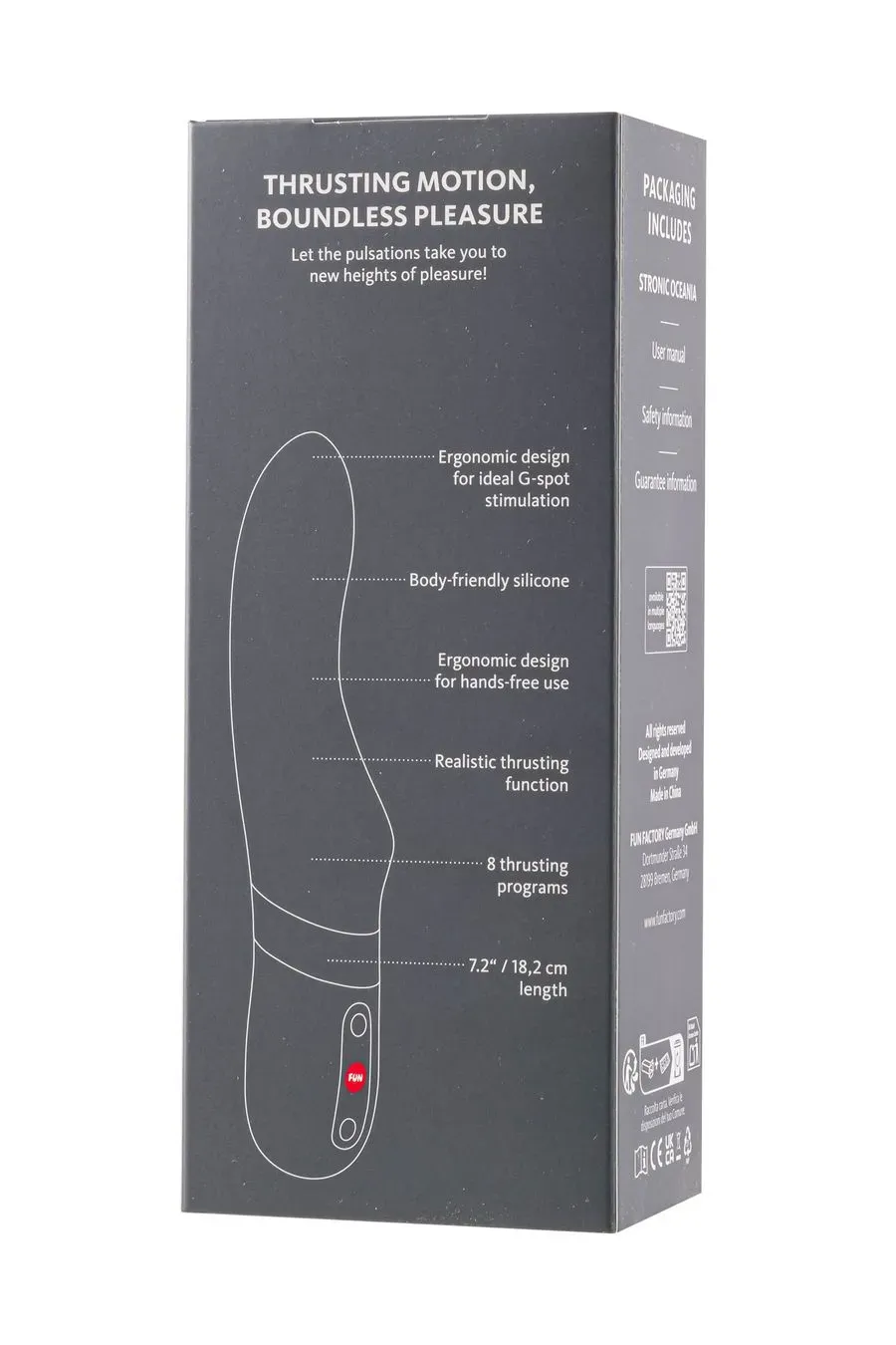 Готовы к реалистичным толчкам, которые вас потрясут? Встречайте STRONIC OCEANIA, пульсатор, который поднимет вас на новый уровень удовольствия с каждым движением и толчком. Благодаря эргономичному, чувственному дизайну и длине 18 см, он идеально лежит в руке и дарит глубокое, приятное ощущение наполненности. Инновационная форма разработана для точной стимуляции точки G и клитора – и все это без помощи рук. Полностью расслабьтесь и позвольте себе погрузиться в самые смелые фантазии, пока пульсатор балует вас реалистичными толчками – как будто кто-то другой управляет им за вас.