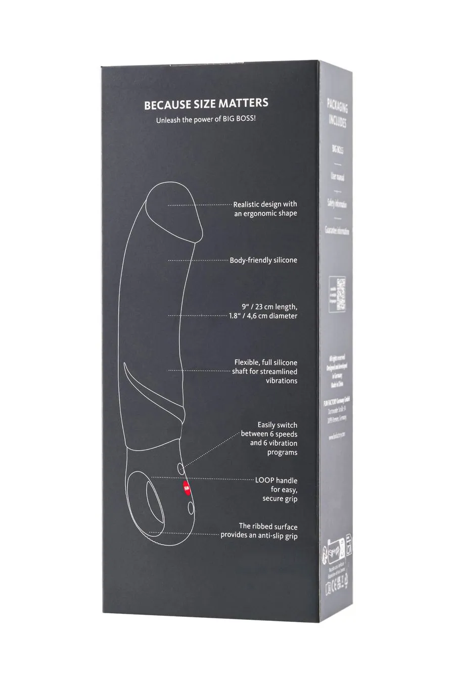 BIG BOSS – потому что размер имеет значение! Этот вибратор XL впечатляет своей длиной в 23 см и диаметром до 4,5 см. Его реалистичный дизайн и плавный изгиб созданы для целенаправленной стимуляции точки G, а гибкий стержень, полностью изготовленный из мягкого силикона, легко движется вместе с вами. Глубокие, низкочастотные вибрации обеспечивают интенсивные ощущения, а эргономичная ручка LOOP с текстурированной ребристой поверхностью обеспечивает противоскользящий захват и полный контроль – как в одиночку, так и с партнером.