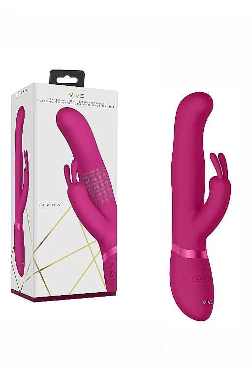 Izara – вибромассажер-кролик в классическом исполнении. Он изготовлен из высококачественного, мягкого, нежного на ощупь 100% медицинского силикона с пылеотталкивающими свойствами и прочного, элегантного АБС-пластика. Вибромассажер оснащен инновационными электродвигателями нового поколения F1. Преимущество такого типа двигателя в том, что он делает интенсивную стимуляцию очень мягкой даже при мощном максимальном воздействии. Игрушка имеет три мощных отдельных мотора, каждый из которых обеспечивает 10 функций вибрации, способной достигать 9200 и 10000 оборотов в минуту. Это дает возможность настраивать более чем 1000 уникальных комбинаций.