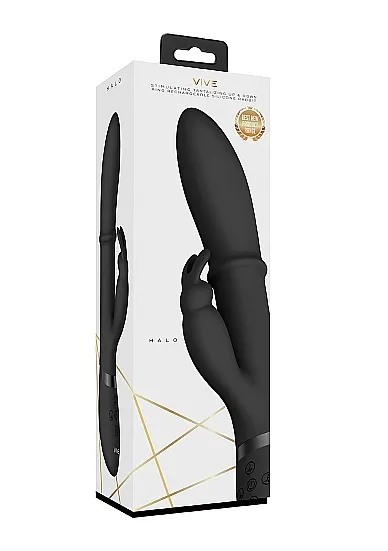 Halo – вибромассажер-кролик в классическом исполнении. Он изготовлен из высококачественного, мягкого, нежного на ощупь 100% медицинского силикона с пылеотталкивающими свойствами и прочного, элегантного АБС-пластика. Вибромассажер оснащен инновационными электродвигателями нового поколения F1. Преимущество такого типа двигателя в том, что он делает интенсивную стимуляцию очень мягкой даже при мощном максимальном воздействии. Игрушка имеет три мощных отдельных мотора, каждый из которых обеспечивает 10 функций вибрации, способной достигать 9200 и 10000 оборотов в минуту. Это дает возможность настраивать более чем 1000 уникальных комбинаций.