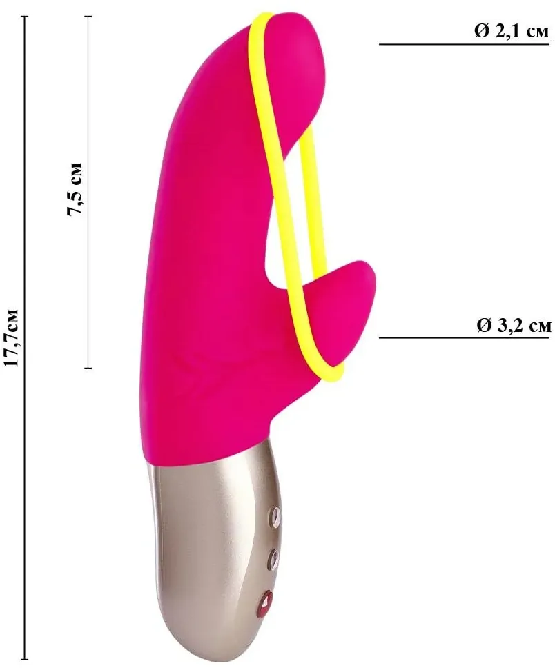 Длина погружной части составляет 7,5 см, а её максимальный диаметр — 2,7 см. Дальше расположен клиторальный отросток, длина которого равна 3 см. Возле него на силиконе изображена стрела, пронзающая сердце. Общая длина гаджета — 17,5 см.