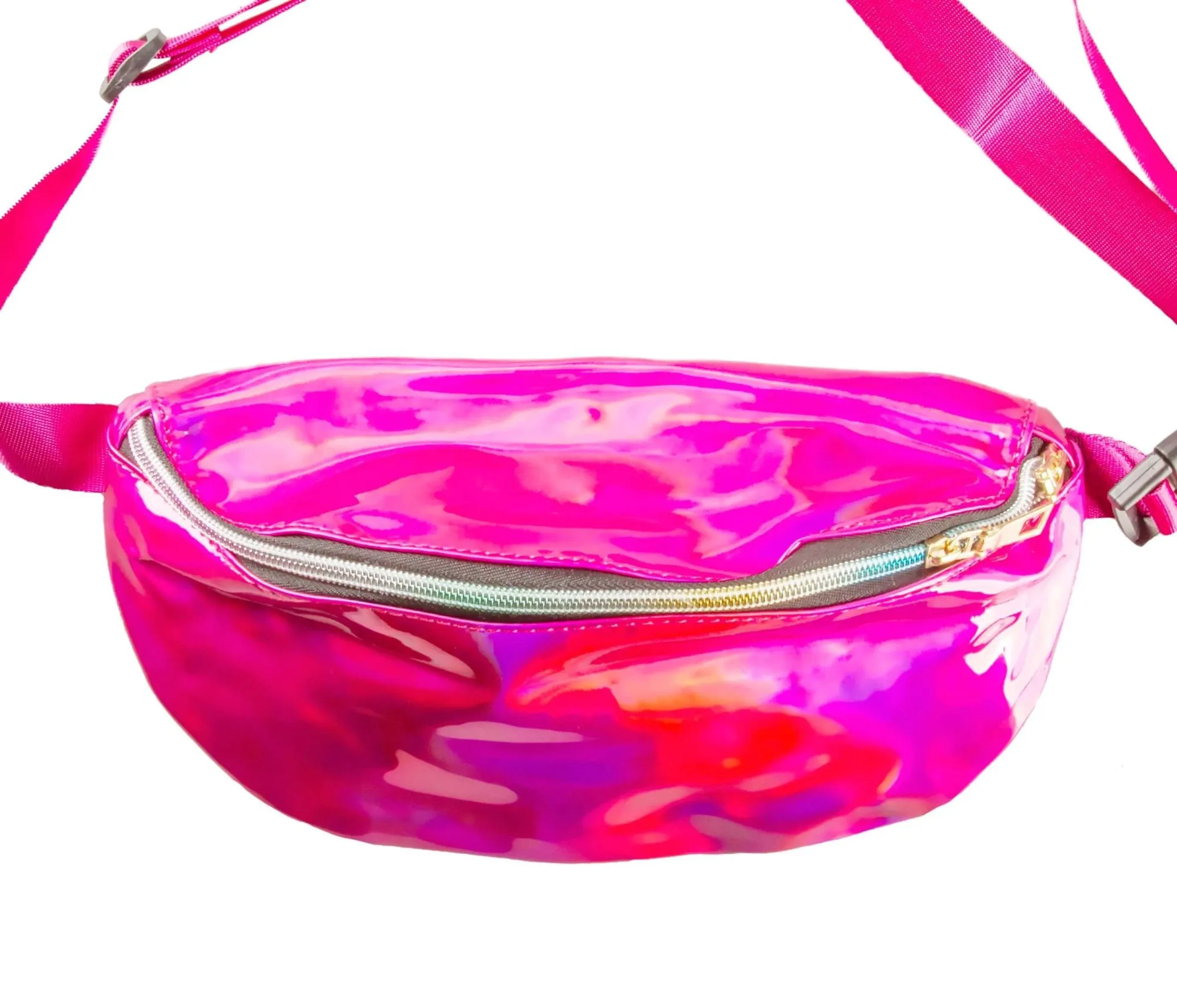 Сумка-бананка из розового голографического материала.